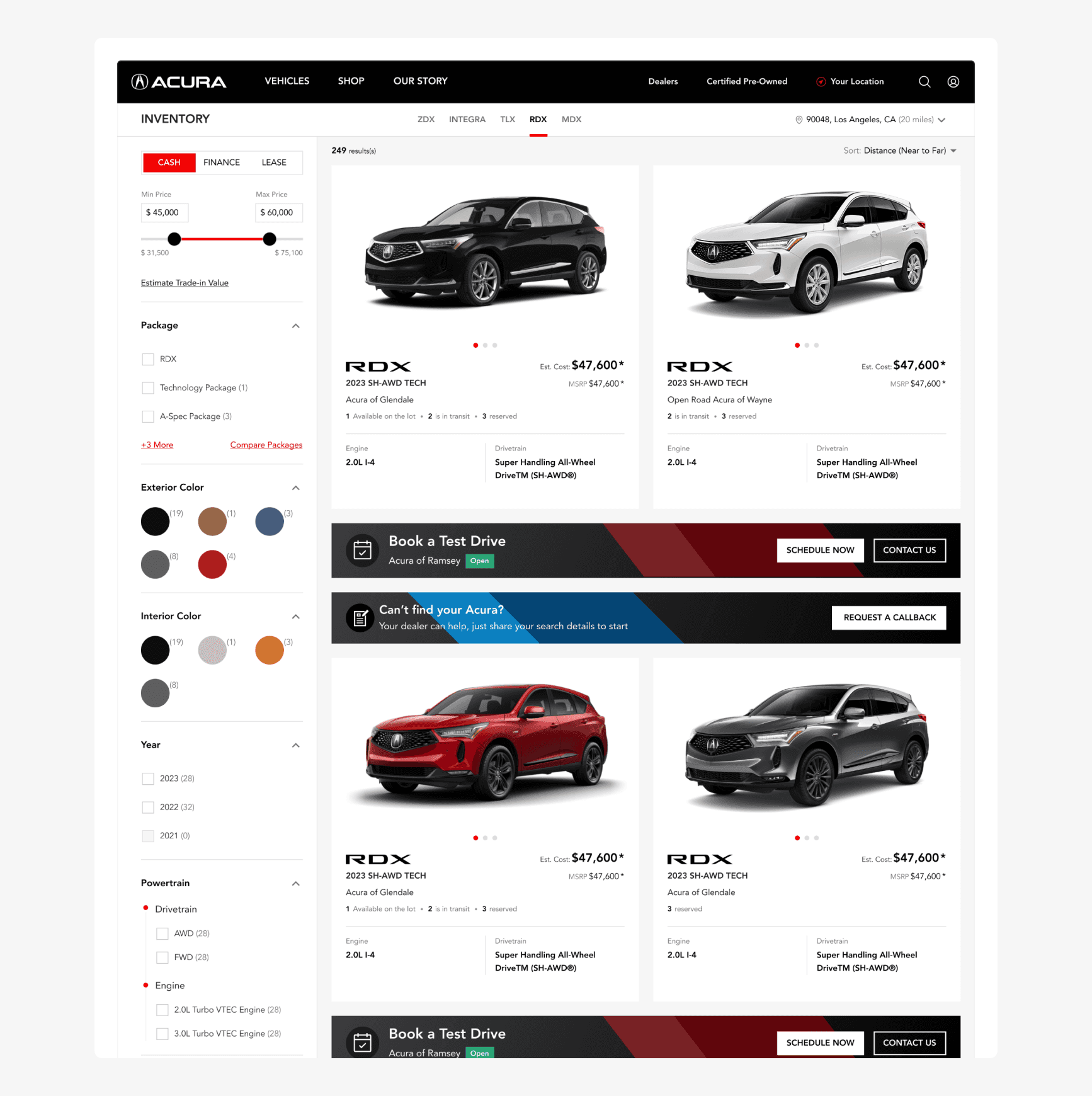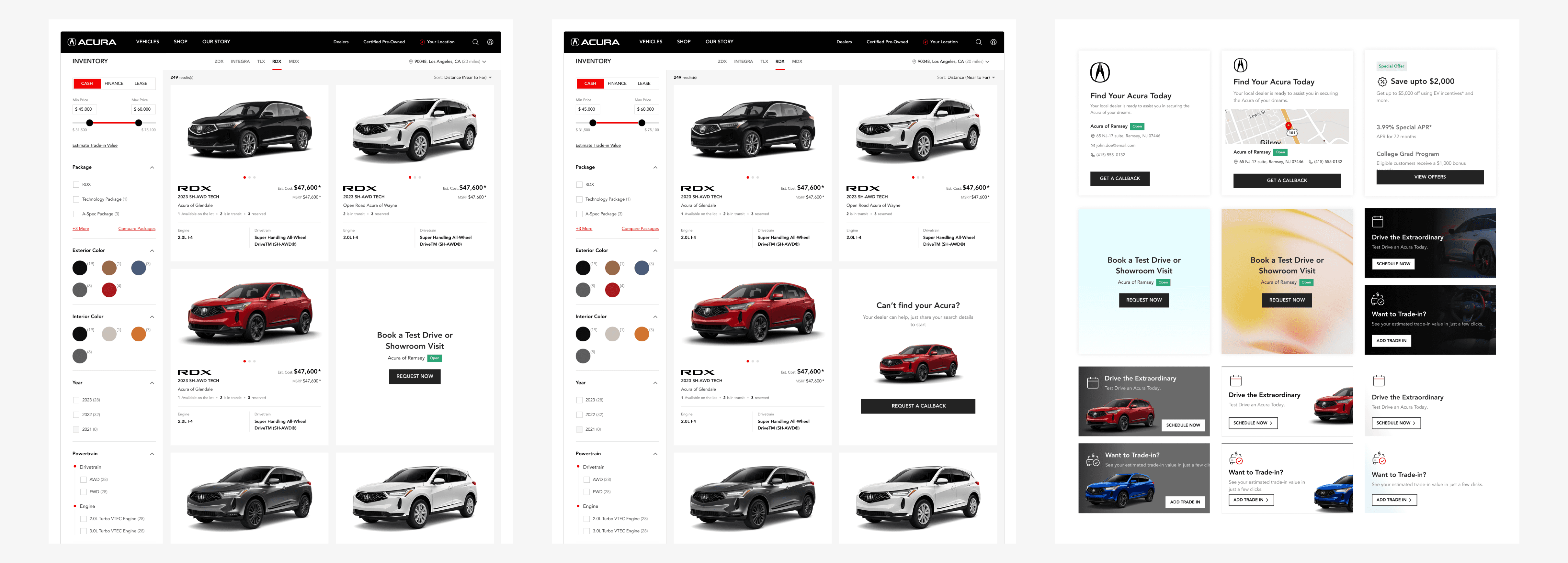 In early iterations, the banners blended too much with the VSR cards. To fix this, we explored multiple variations in layout and contrast. The final version followed Acura’s visual language. Premium and distinct enough to draw attention without stealing focus from the vehicles.