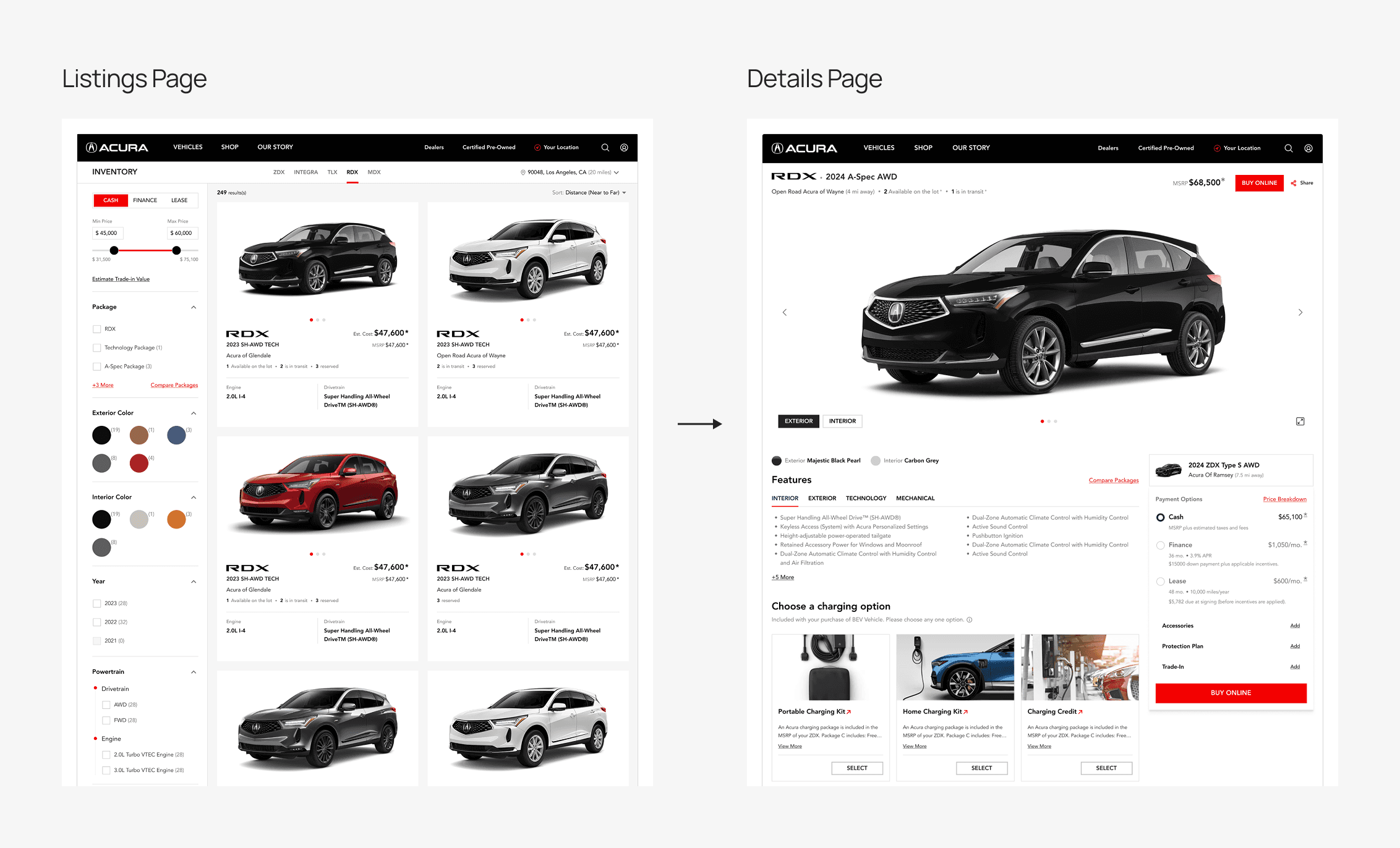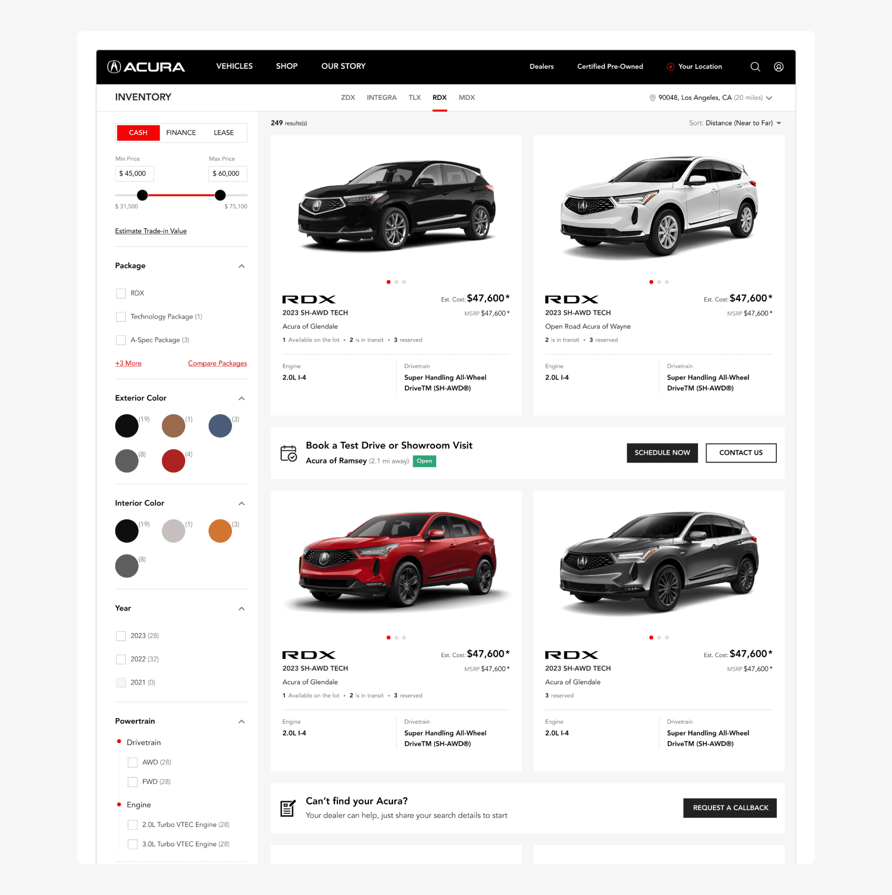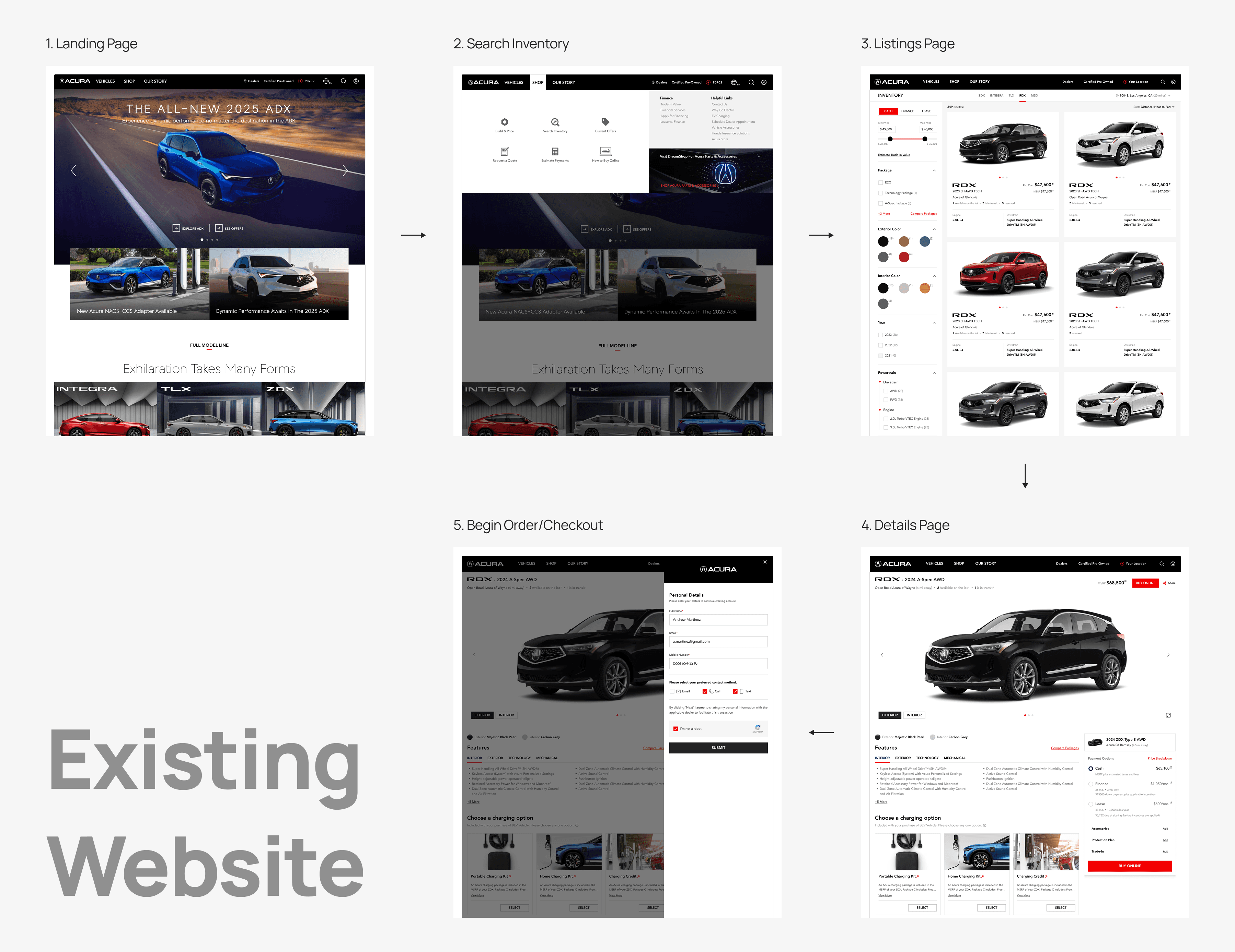 At a high level, the Acura website follows a familiar ecommerce pattern. Users browse inventory, evaluate options, and move forward when ready. The difference is that car buying is a high value, high involvement decision, so intent builds gradually.